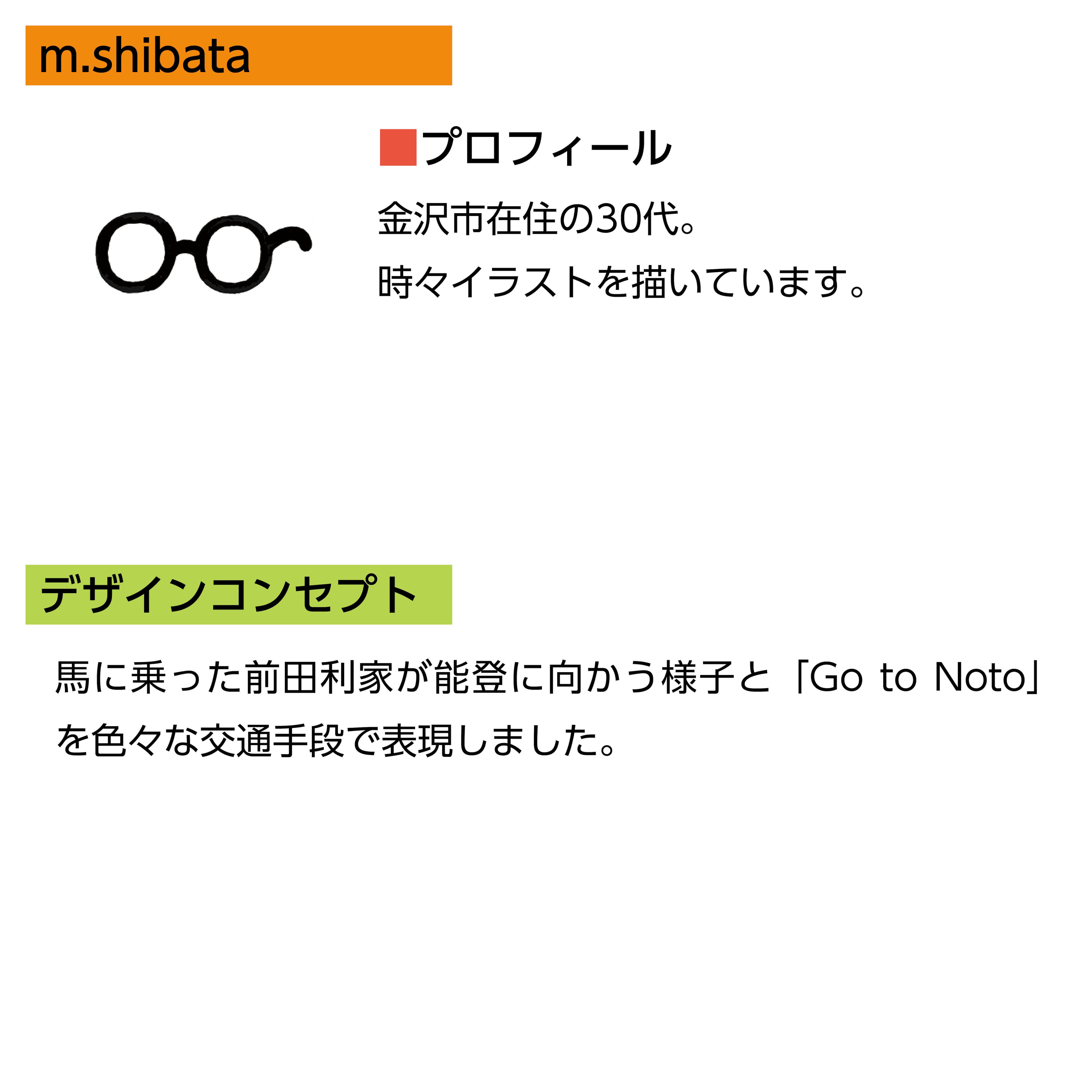 馬に乗った前田利家が能登に向かう様子と「Go to Noto」を色々な交通手段で表現しました。
