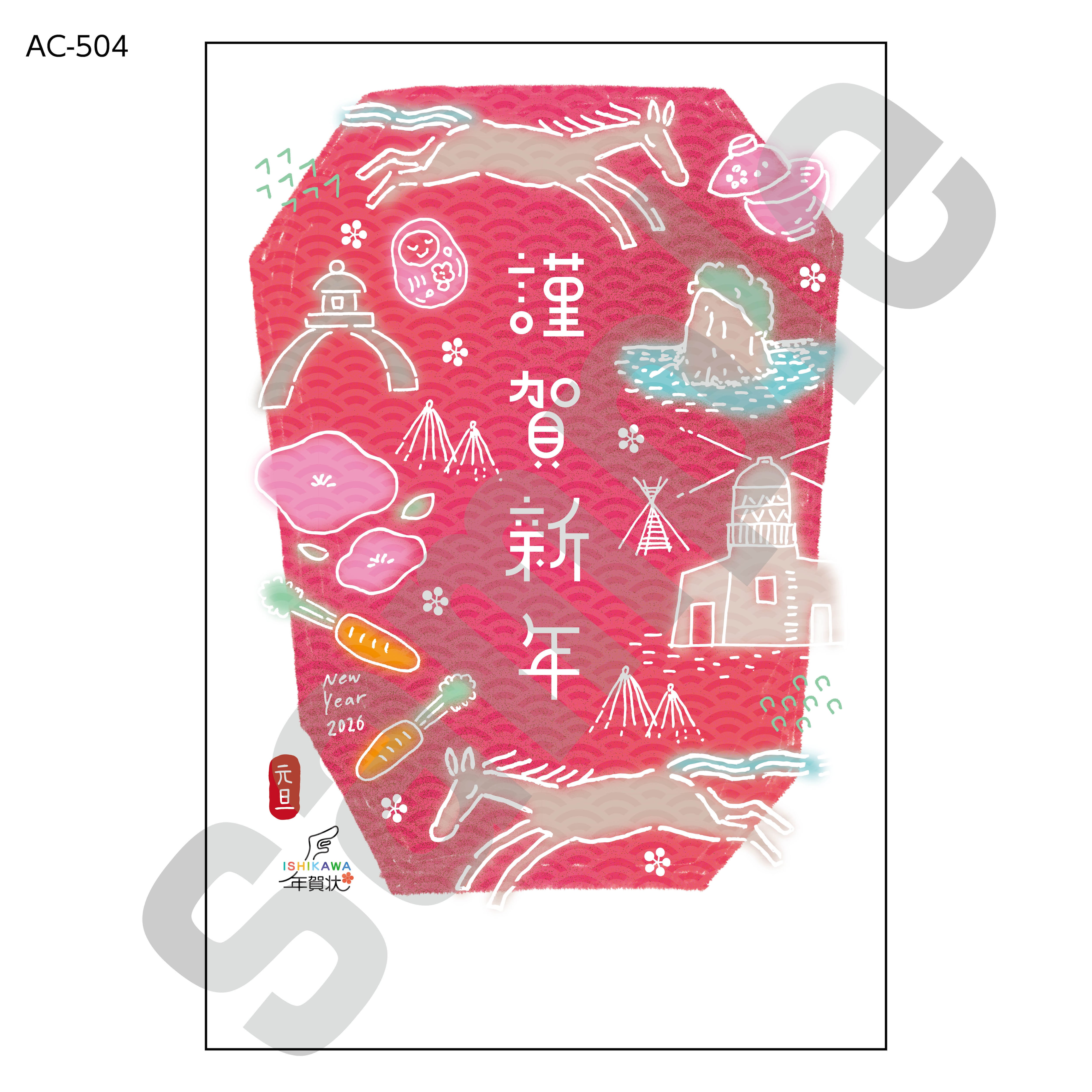 ことじ灯籠、見附島、輪島塗など、穏やかな金沢・能登の風景。馬たちとともに、一年を元気に駆け抜けることを願って。