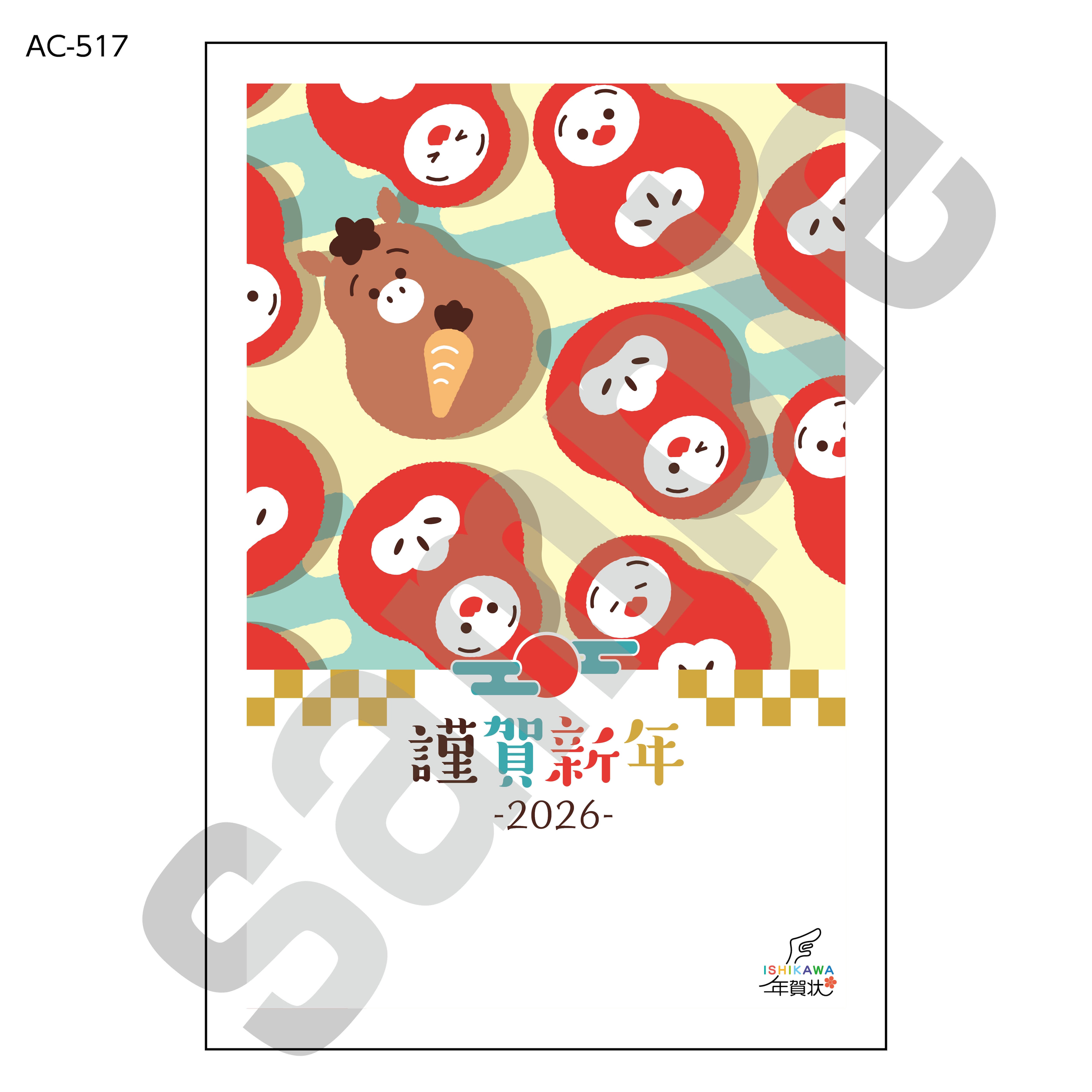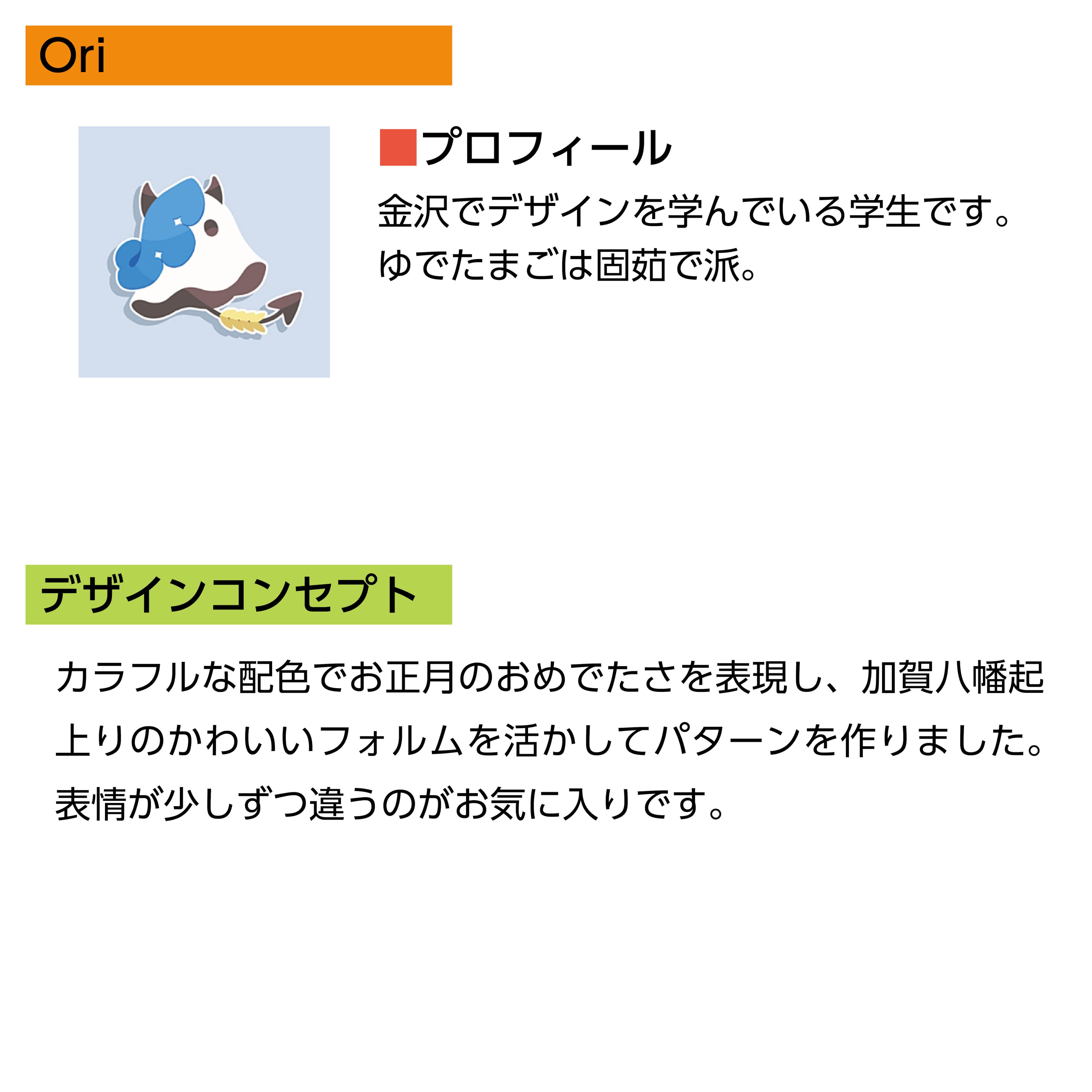 カラフルな配色でお正月のおめでたさを表現し、加賀八幡起上りのかわいいフォルムを活かしてパターンを作りました。表情が少しずつ違うのがお気に入りです。