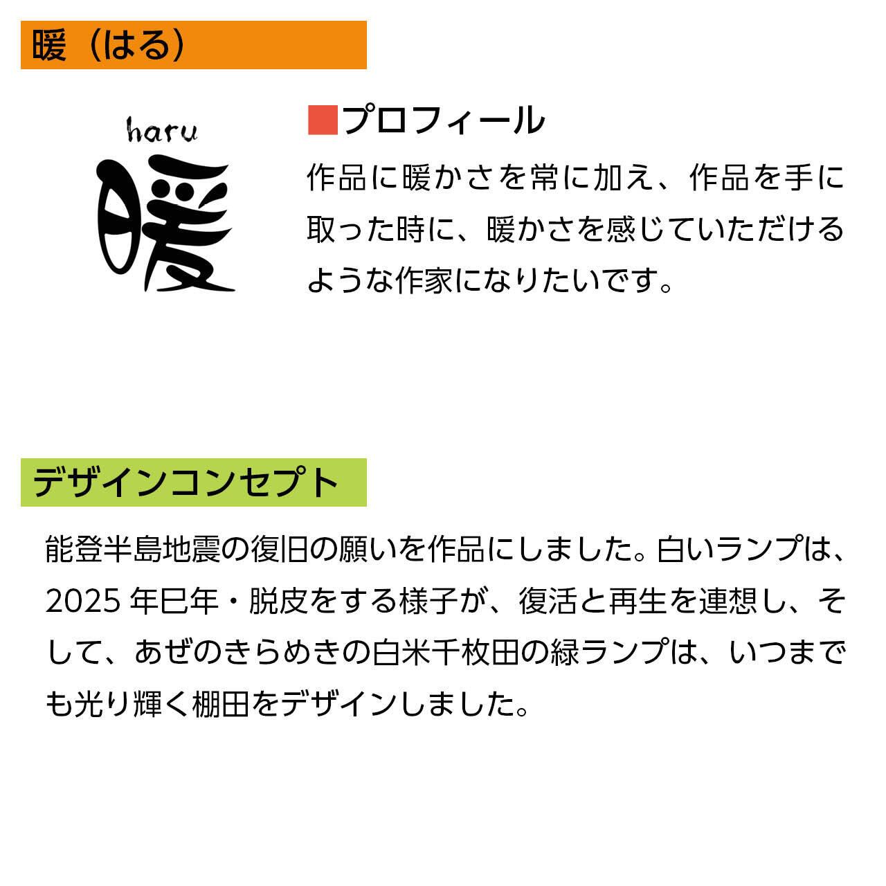 能登半島地震の復旧の願いを作品にしました。白いランプは、2025年巳年・脱皮をする様子が、復活と再生を連想し、そして、あぜのきらめきの白米千枚田の緑ランプは、いつまでも光り輝く棚田をデザインしました。