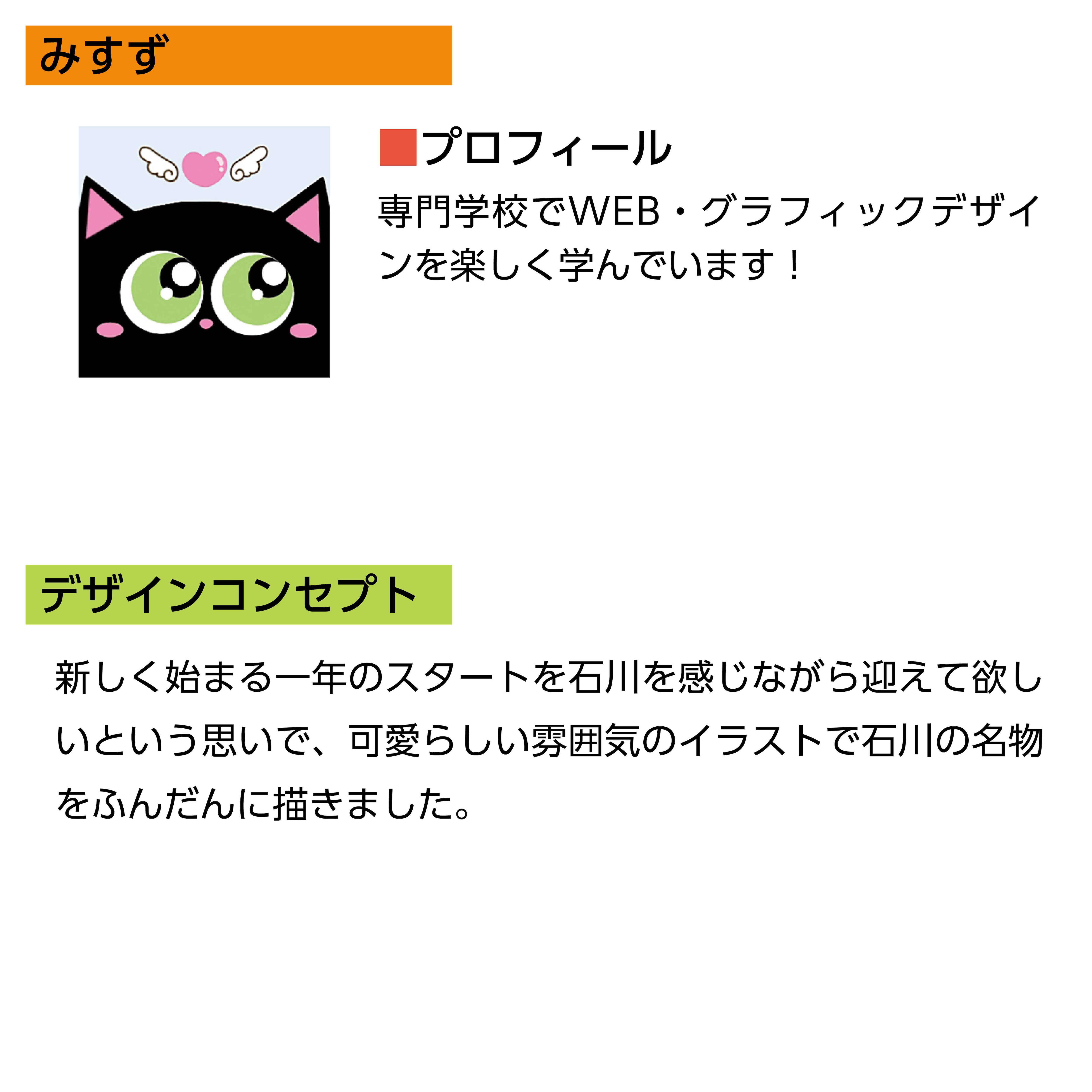 新しく始まる一年のスタートを石川を感じながら迎えて欲しいという思いで、可愛らしい雰囲気のイラストで石川の名物をふんだんに描きました。