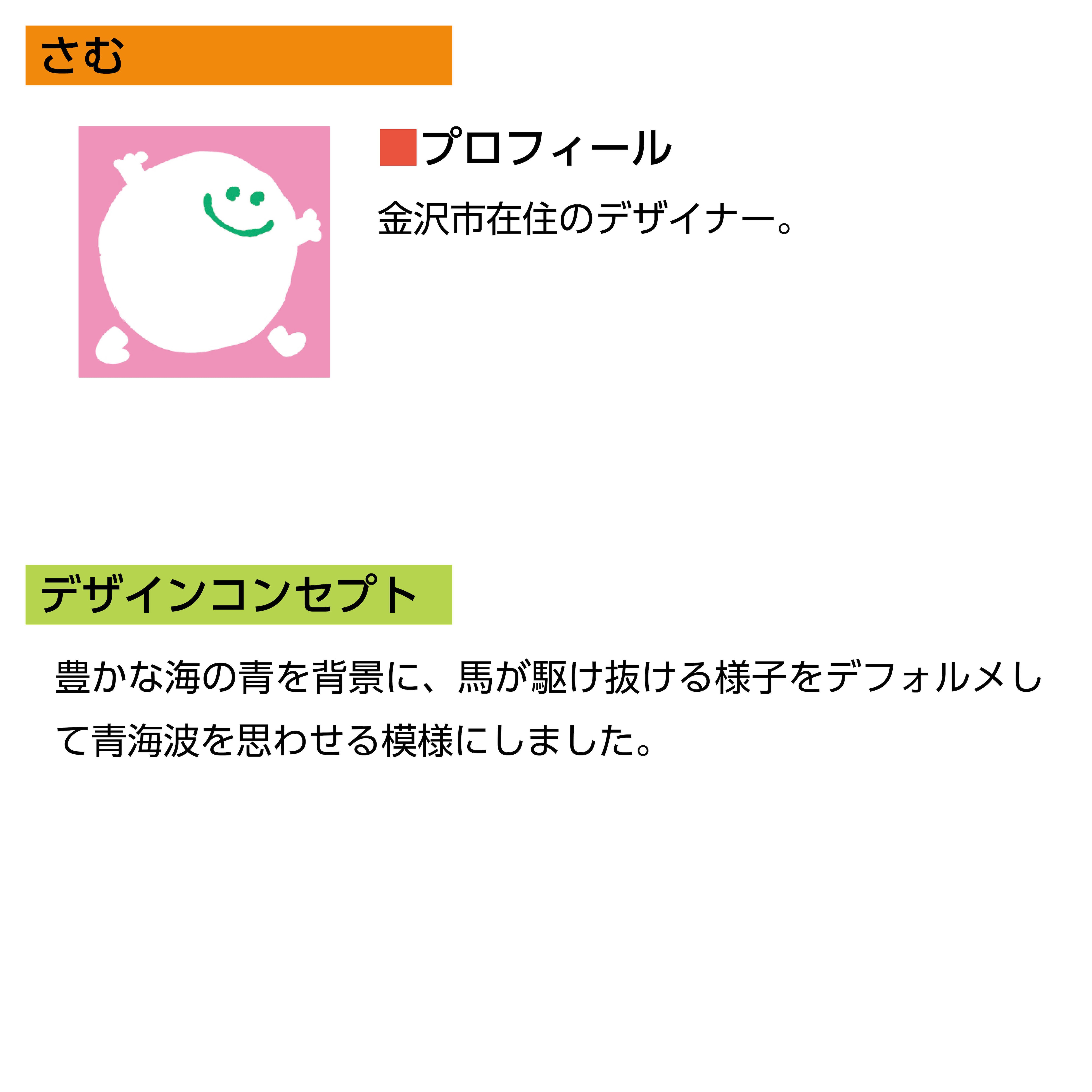 豊かな海の青を背景に、馬が駆け抜ける様子をデフォルメして青海波を思わせる模様にしました。