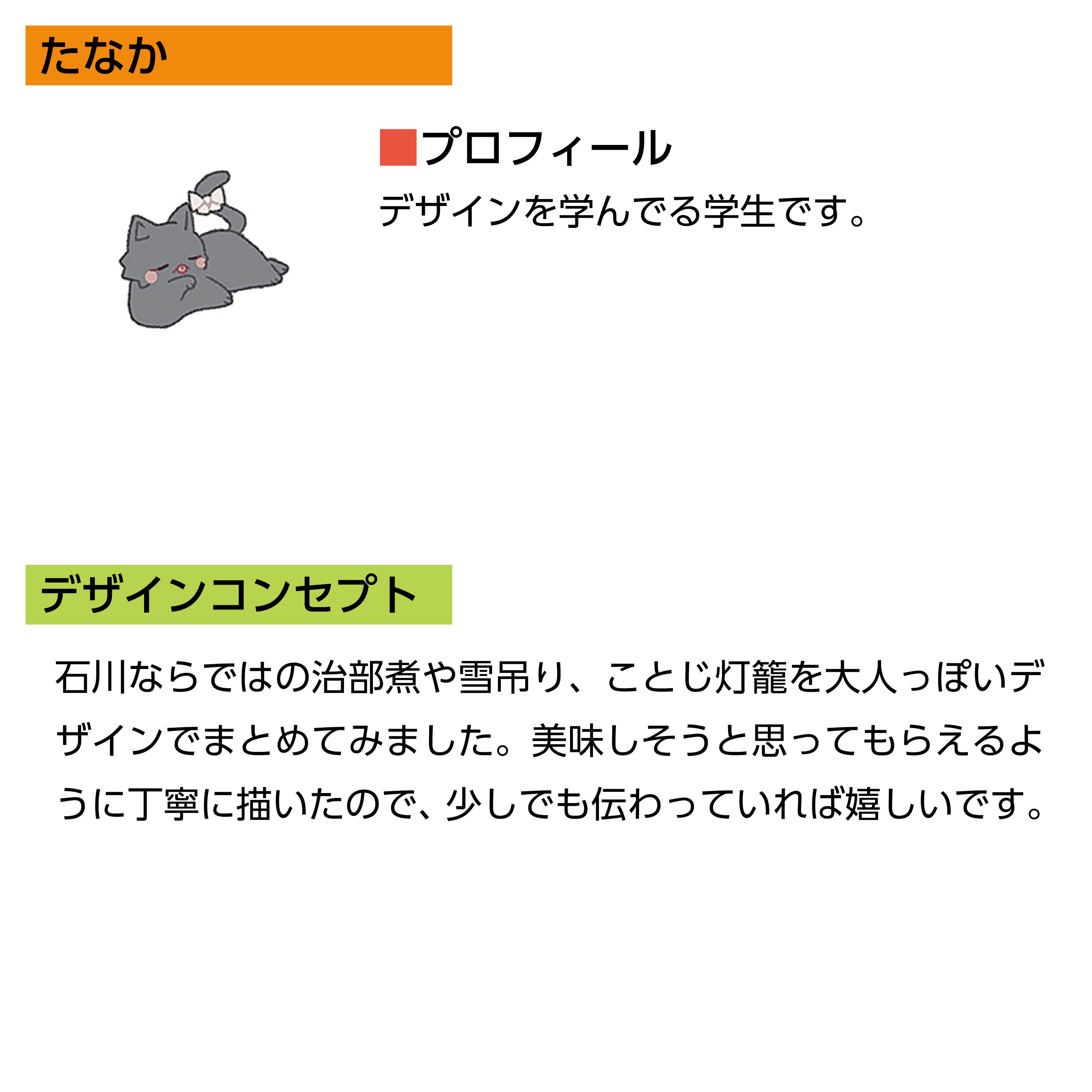 石川ならではの治部煮や雪吊り、ことじ灯籠を大人っぽいデザインでまとめてみました。美味しそうと思ってもらえるように丁寧に描いたので、少しでも伝わっていれば嬉しいです。