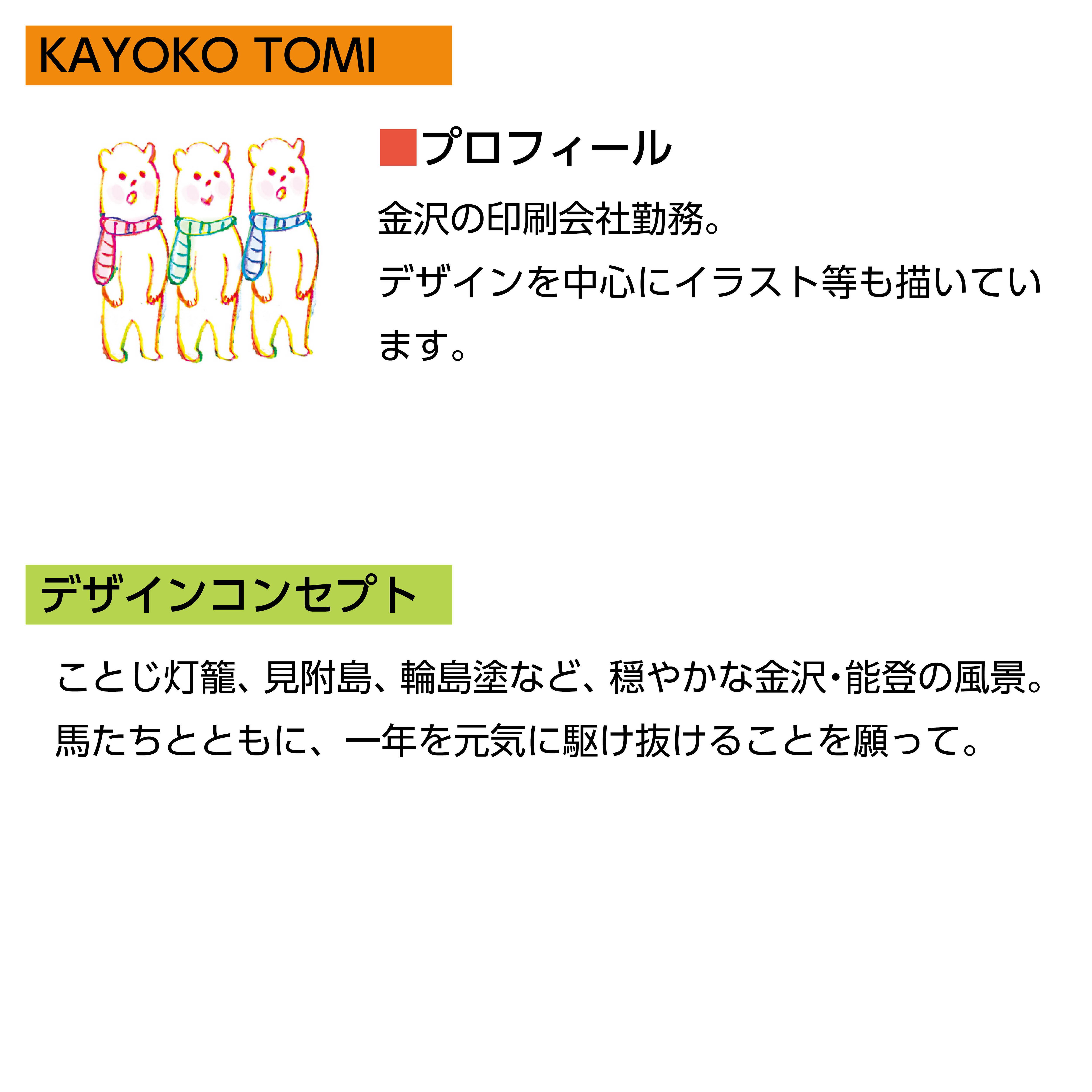 ことじ灯籠、見附島、輪島塗など、穏やかな金沢・能登の風景。馬たちとともに、一年を元気に駆け抜けることを願って。