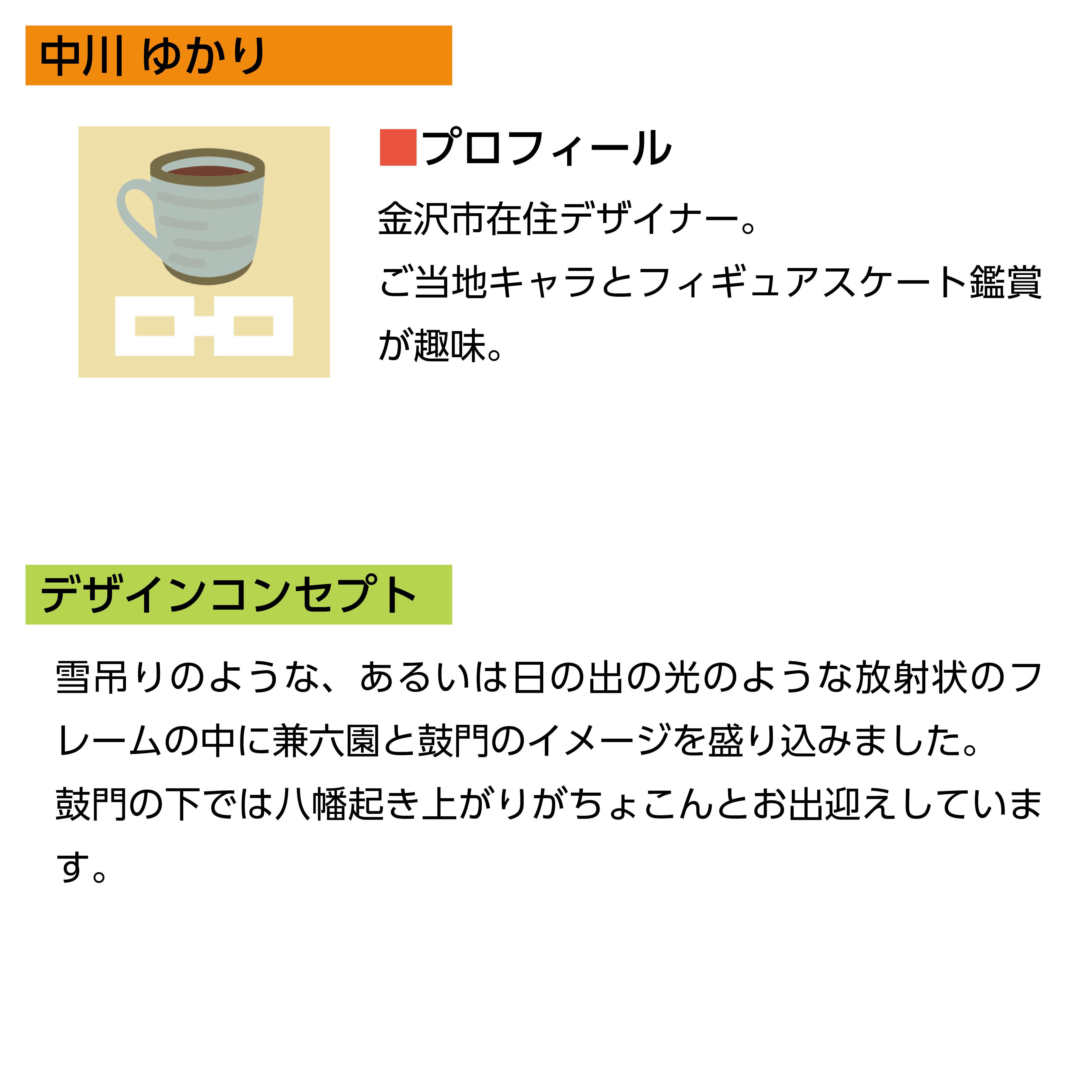 雪吊りのような、あるいは日の出の光のような放射状のフレームの中に兼六園と鼓門のイメージを盛り込みました。